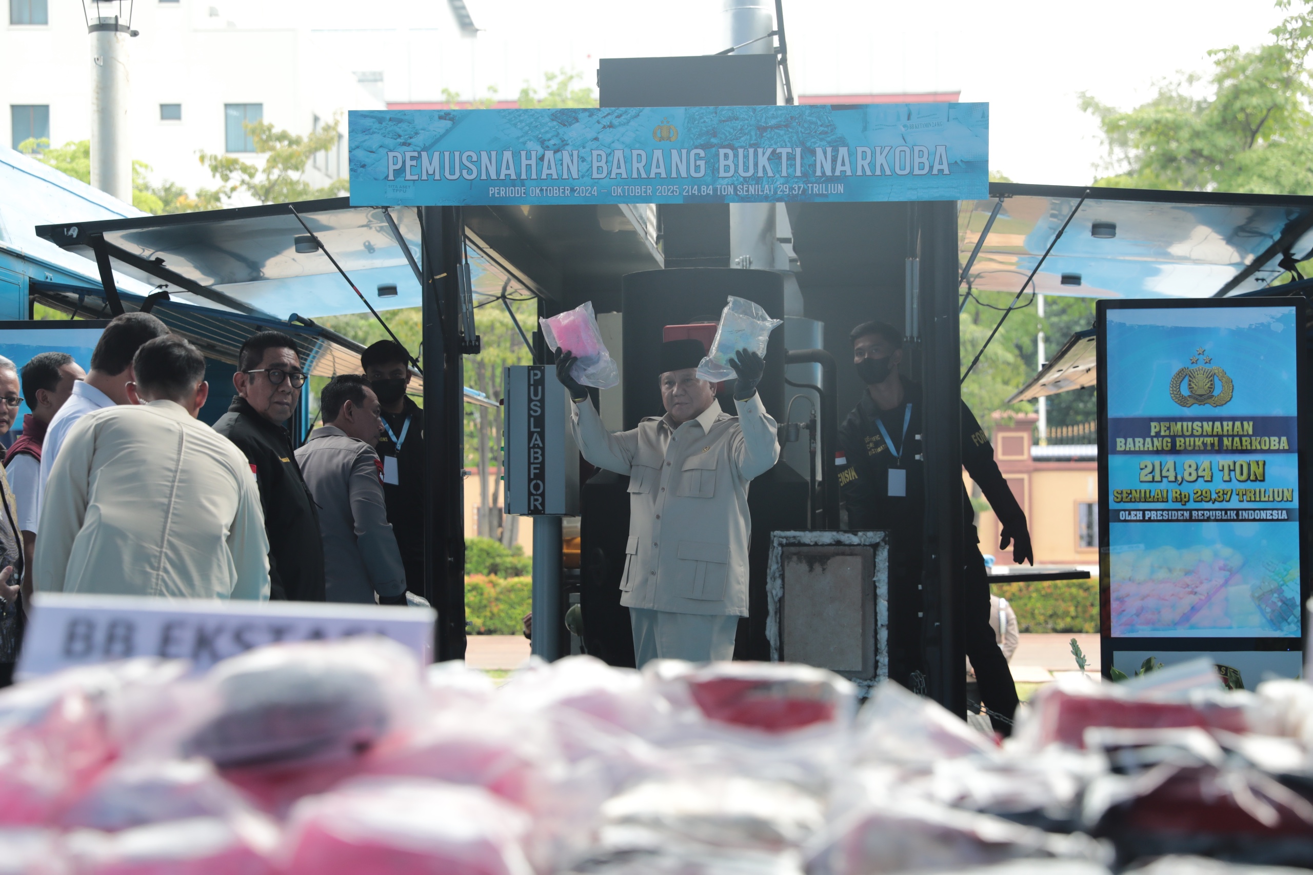 Jakarta — Presiden Republik Indonesia Prabowo Subianto menyampaikan apresiasi tinggi kepada jajaran Kepolisian Negara Republik Indonesia (Polri) atas keberhasilan menyita dan memusnahkan total 214,84 ton barang bukti narkoba selama periode satu tahun pemerintahannya, yaitu Oktober 2024 hingga Oktober 2025.