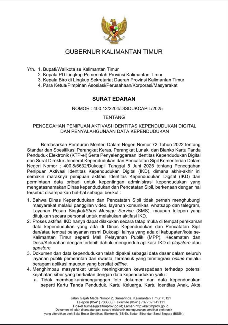 Imbauan tentang Identitas Kependudukan Digital (IKD) ini tertuang dalam Surat Edaran Gubernur Kaltim Nomor 400.12/2204/DISDUKCAPIL/2025 yang ditandatangani langsung oleh Gubernur Kalimantan Timur, H. Rudy Mas’ud, pada 5 Agustus 2025.